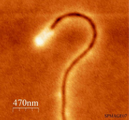 科学家们使用静电力显微镜获取了这张绦虫状的图像,图中展示了直径为18纳米的碳纳米管发出的电荷。马瑞兹·兹德洛杰克表示,静电力显微镜影响了静电力,从而获取了这些图像,这是无法通过扫描隧道显微技术实现的。兹德洛杰克说:“静电力显微镜是一种非常简易的方法,它可以在纳米世界中观察包括纳米管在内任何物体的静电性。我希望我的研究能带来一种新电子设备的诞生。”图中明亮的光晕是由纳米管帽发射出的电荷所产生的,放电时,纳米管则变暗。