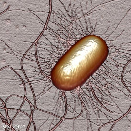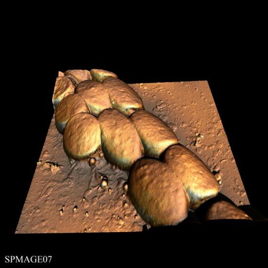 这个大肠埃希杆菌展示了长仅30纳米的保存完好的鞭毛。为了制作这个图像,科学家们使用了一个原子力显微镜。与扫描隧道显微技术不同,这个原子力显微镜的尖端直接与样本表面接触了。通过测量插入微型悬臂中的力,可以计算显微镜尖端之间的力。原子力显微镜非常灵敏,它们可以探测到兆分之一牛顿大小的力。