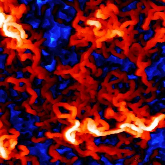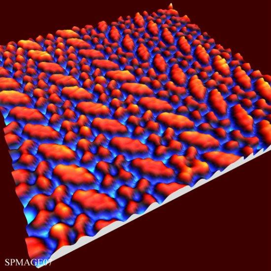 这个长宽都是13纳米的图像展示了,使用分子束在一个单金晶体上进行二茚并二萘嵌苯和铜钛菁的分层结果。这些平面有机分子显示出了半导体属性。图中展示了分子是如何在某种状况下进行自我排列,这对计划制造未来半导体的科学家而言意义重大。