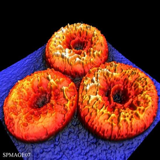 该图是由托斯藤·兹欧姆巴在德国实验室中捕获的图像,它展示了锗硅量子点——仅高15纳米,直径为70纳米。