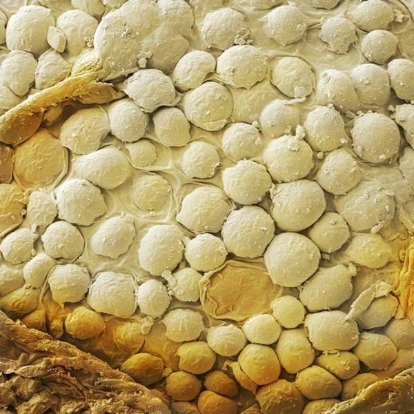 我们还是比较清楚的可以看到芝麻表皮细胞的样子,通常脂肪油脂也是储存在这种细胞里面的。由于电子显微镜只能拍摄黑白图像,彩色图像需要用到电脑进行特别渲染和处理。天纵君选择了一张别人做好了的芝麻表皮细胞的微观渲染图,芝麻的脂肪细胞更加清晰了。