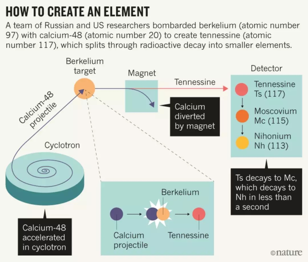 但这四种元素被发现后,引起了广泛的争议,最主要的原因在于这几种元素其实都不是可以自然形成的,它可以说是一种人造新元素。现代技术可以使用某种元素的原子核作为“炮弹”来轰击另一种元素的原子核,两种原子核熔合在一起后,质子数发生改变,新元素也就诞生了。