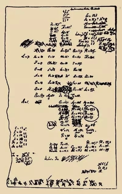 到了4年后的1869年,门捷列夫将当时已知的几种元素的主要性质和原子量,写在了一张张小卡片上,进行反复排列比较,最后据说是在“睡梦中”发现了元素的周期性规律,并依此制定了元素周期表。最早门捷列夫的元素周期表的手稿如下: