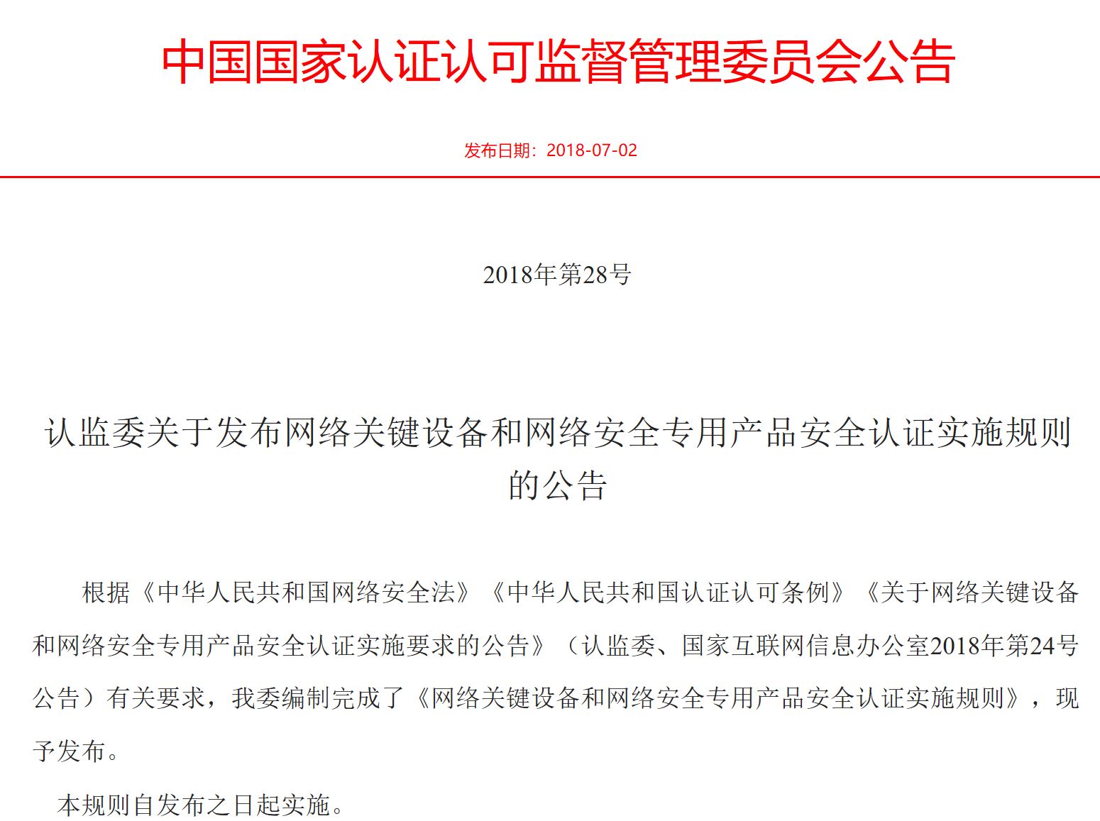 2018年7月2日,中国国家认证认可监督管理委员会发布了2018年第28号公告即《认监委关于发布网络关键设备和网络安全专用产品安全认证实施规则的公告》。