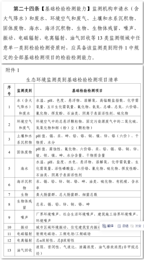 (六)基础检验检测能力要求。第二十四条主要规定了生态环境监测机构申请 13 类监测领域中任意单一类别检验检测资质时,必须具备的基础检验检测项目,确保检测机构能够完整完成某领域监测任务。根据该修订草案,比较大的一个变化就是这个第二十四条(修订后《补充要求》由二十三条变为二十四条)。其中修订完善十九个条款,增加了一个有关“基础检验检测能力”要求的条款。
