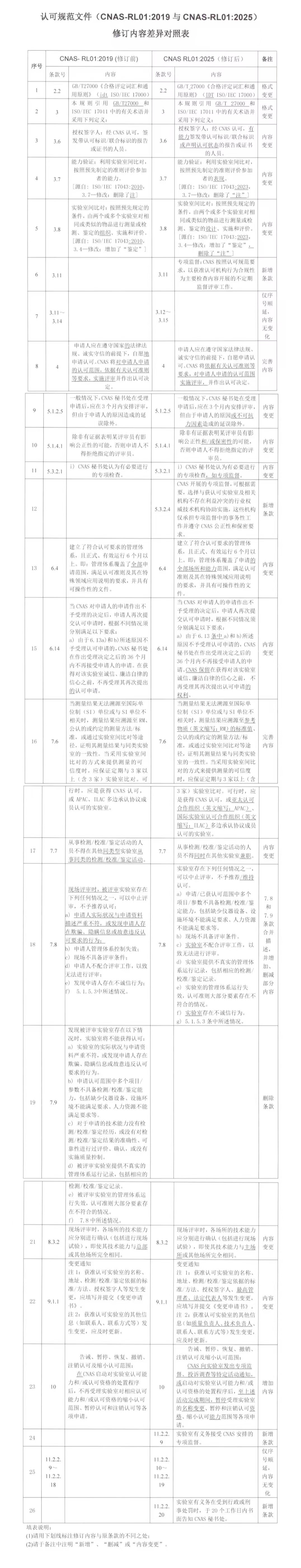 CNAS-RL01:2019和2025版修订内容对照如下:
