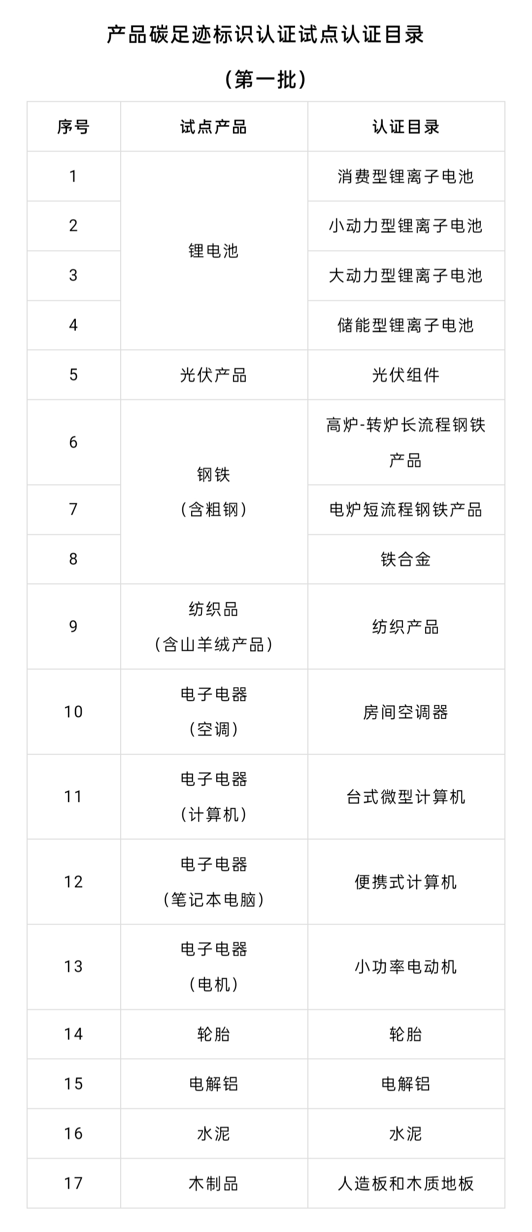 该通知明确了全国首批产品碳足迹标识认证试点认证目录,包括锂离子电池、光伏组件、钢铁产品、纺织产品、房间空调器、计算机、小功率电机、轮胎、电解铝、水泥、人造板和木质地板等17种产品。