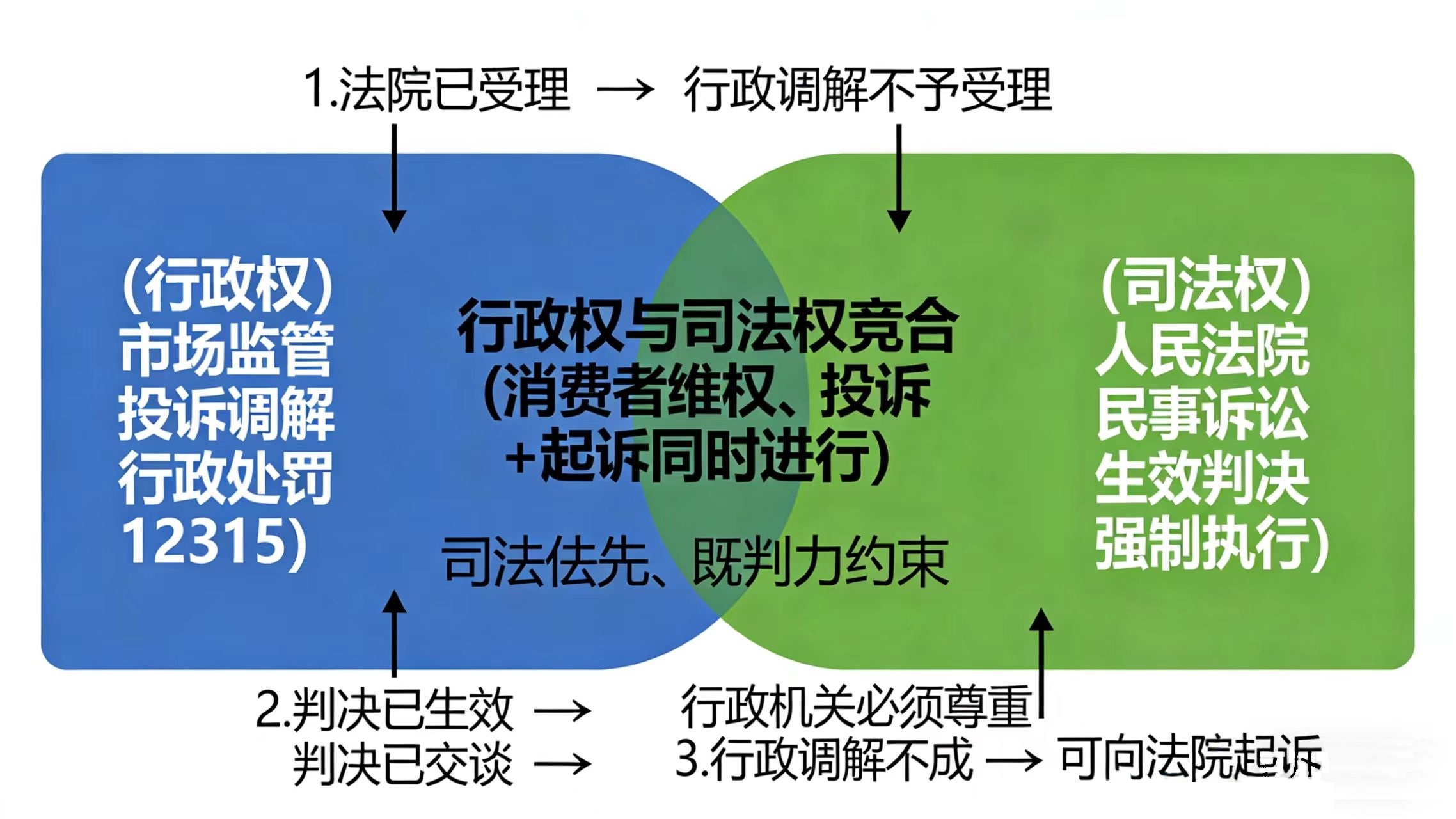 最后总结说来,消费维权,行政是帮忙,法院是最终说了算的。法院一插手,行政就要退出;法院一判完,这事就定了。这就是行政权与司法权竞合时,最标准、最合法、最不会错的处理方式。